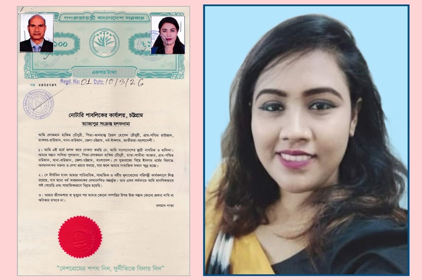 পরিবারের মান-সম্মান ও ধর্মীয় আদর্শ রক্ষার্থে মেয়ে সাদিয়া সুলতানাকে ‘ত্যাজ্য’ করেছেন বাবা লোকমান হাকিম চৌধুরী। সম্প্রতি চট্টগ্রামে এক নোটারি পাবলিকের কার্যালয়ে উপস্থিত হয়ে হলফনামা সম্পাদনের মাধ্যমে তিনি এই ঘোষণা দেন।